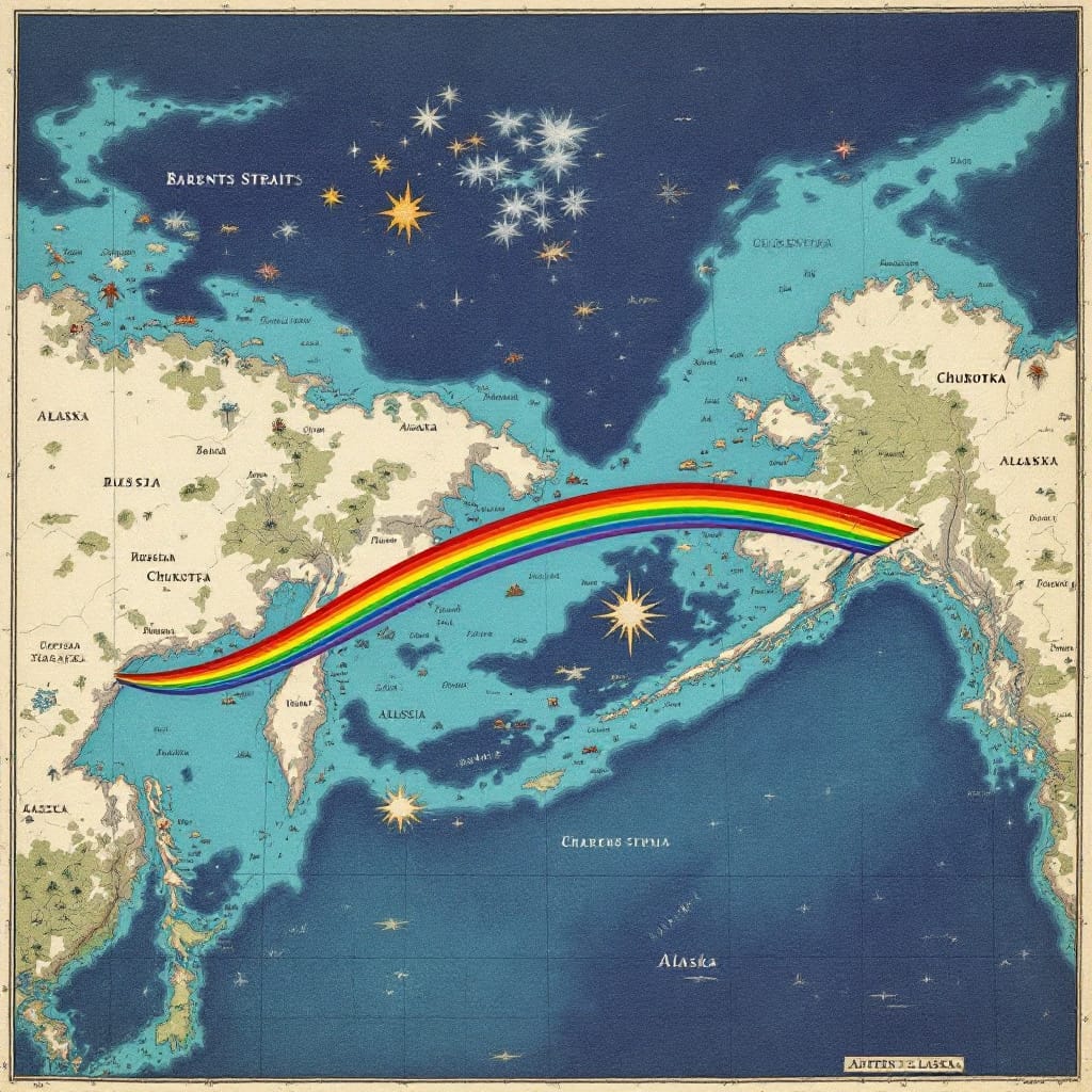 Dostępne dla mnie modele AI do generacji obrazów niestety słabo znają się na geografii, a ich stosowanie się do poleceń także jest dalekie od ideału. Mamy tutaj Alaskę i Czukotkę po obu stronach.
