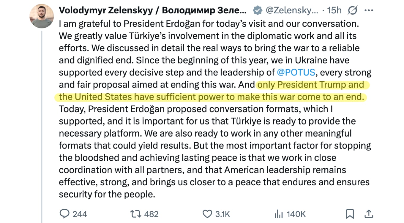 Jestem wdzięczny prezydentowi Erdoğanowi za dzisiejszą wizytę i naszą rozmowę. Bardzo cenimy zaangażowanie Turcji w pracę dyplomatyczną i wszelkie jej wysiłki. Szczegółowo omówiliśmy realne sposoby doprowadzenia wojny do godnego i wiarygodnego zakończenia. Od początku tego roku my na Ukrainie wspieraliśmy każdy zdecydowany krok i przywództwo @POTUS [President of the US], każdą mocną i sprawiedliwą propozycję mającą na celu zakończenie tej wojny. I tylko prezydent Trump i Stany Zjednoczone mają wystarczającą siłę, aby doprowadzić do zakończenia tej wojny.