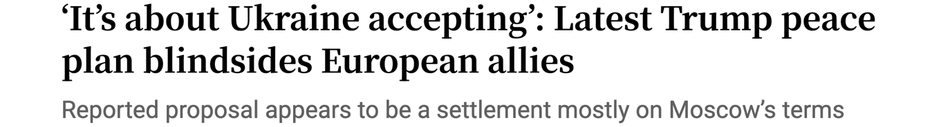 Warto zauważyć, iż 28-punktowy plan jest dopracowany, szczegółowy i porusza wszystkie istotne kwestie. Zatem różne agendy rządu Trumpa pracowały nad nim przez jakiś czas. Tymczasem plan pojawił się nagle, nie było żadnych przecieków ani sugestii nawet, iż coś takiego może być przygotowywane. Plan reguluje wszystkie istotne kwestie, w szczególności trzymanie Ukrainy z dala od NATO oraz kwestie terytorialne.