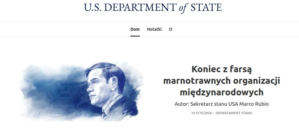 W tym tygodniu zgodnie z ustaleniami Rozporządzenia Wykonawczego nr 14199 prezydent Trump ogłosił wycofanie się z 66 organizacji międzynarodowych zidentyfikowanych w ramach trwającego przeglądu prowadzonego przez administrację Trumpa pod kątem nieefektywnych, nieskutecznych i szkodliwych organizacji międzynarodowych. Memorandum Prezydenckie dotyczy instytucji, które są nadmiarowe, czyli zbędne w swoim zakresie, niewłaściwie prowadzone, niepotrzebne, nieefektywne, źle zarządzane, skorumpowane przez podmioty realizujące własne cele sprzeczne z naszymi lub stanowiące zagrożenie dla suwerenności, wolności i ogólnego dobrobytu naszego narodu.